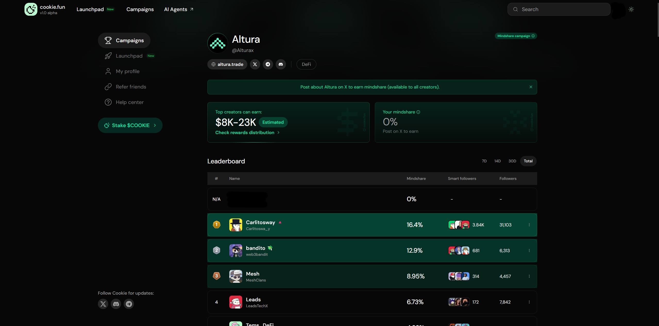 2. Create valuable content about Altura and publish it on X. The more attention and engagement your posts attract, the more Mindshare you can earn. Check the documentation if you have any questions about participating in Cookiefun campaigns.