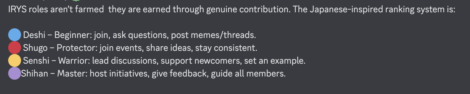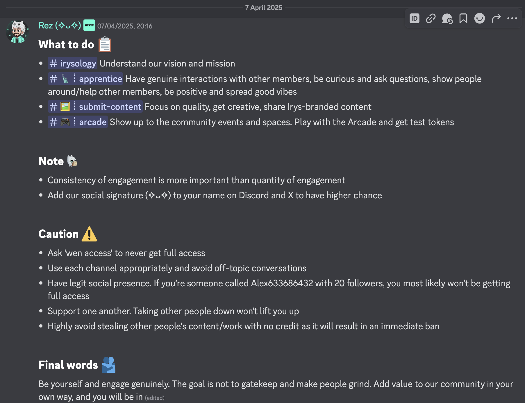 There are several roles in Irys' Discord server for active members who will create content/memes and help newcomers. But first, you need to get full access to the server. To do this, just communicate, be yourself, and DO NOT ASK for full access. After a while, every member who deserves it will get full access.