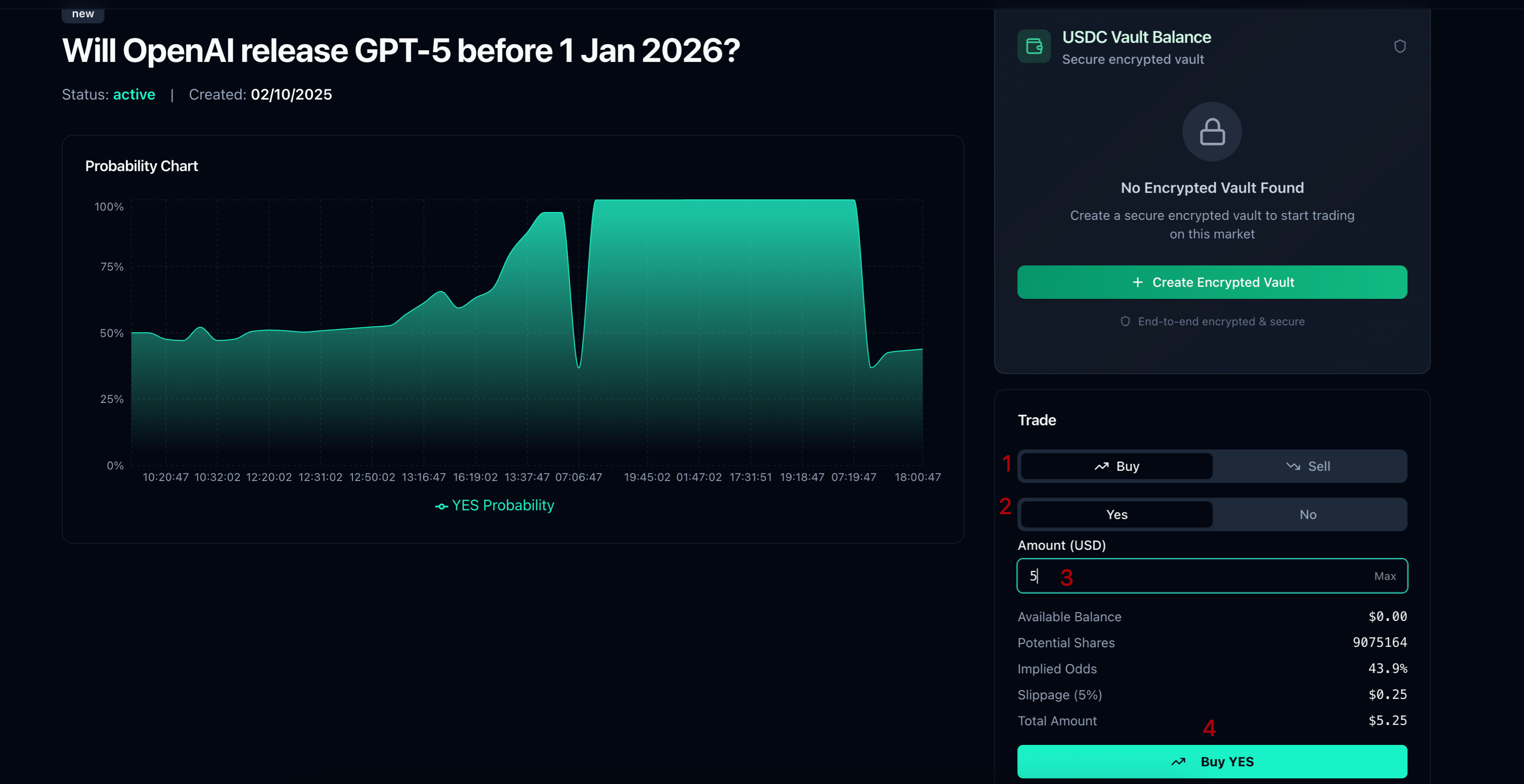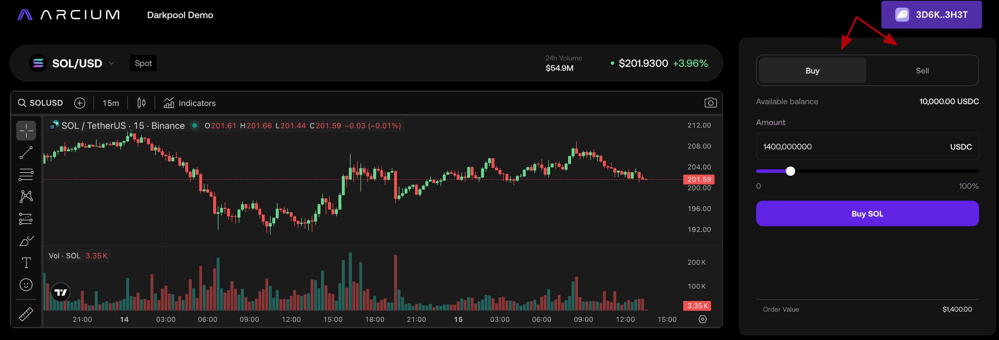 3. Go to DarkPool, connect your wallet and buy/sell SOL:
