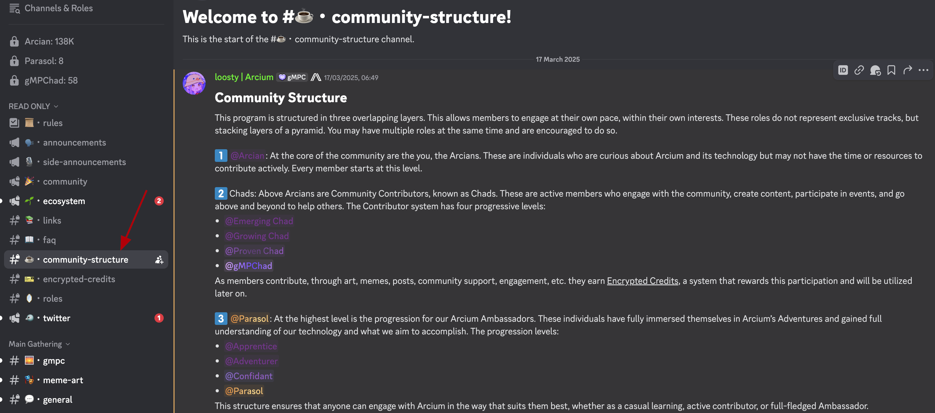 2. Open the #community-structure channel and familiarize yourself with the available roles. Here you can also find a guide on how to get started on the server and a channel with quests: