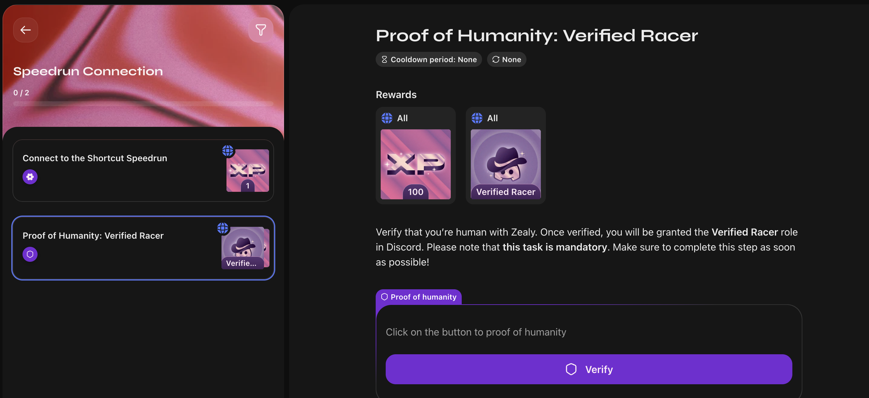 2. Go to Zealy and complete the tasks. You'll get 100 XP and the Verified Racer role on Discord for doing this: