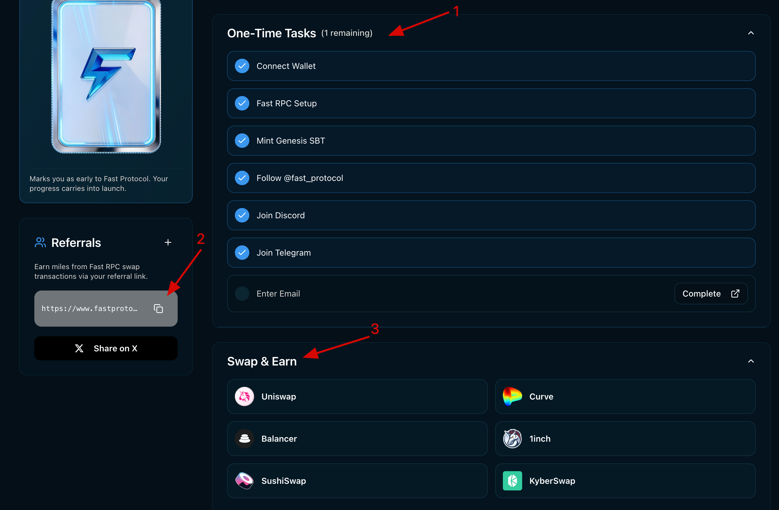 2. After that, you will get access to the dashboard. Complete tasks, invite friends, and earn miles for swaps on the Ethereum network using the project's RPC (videoguide):