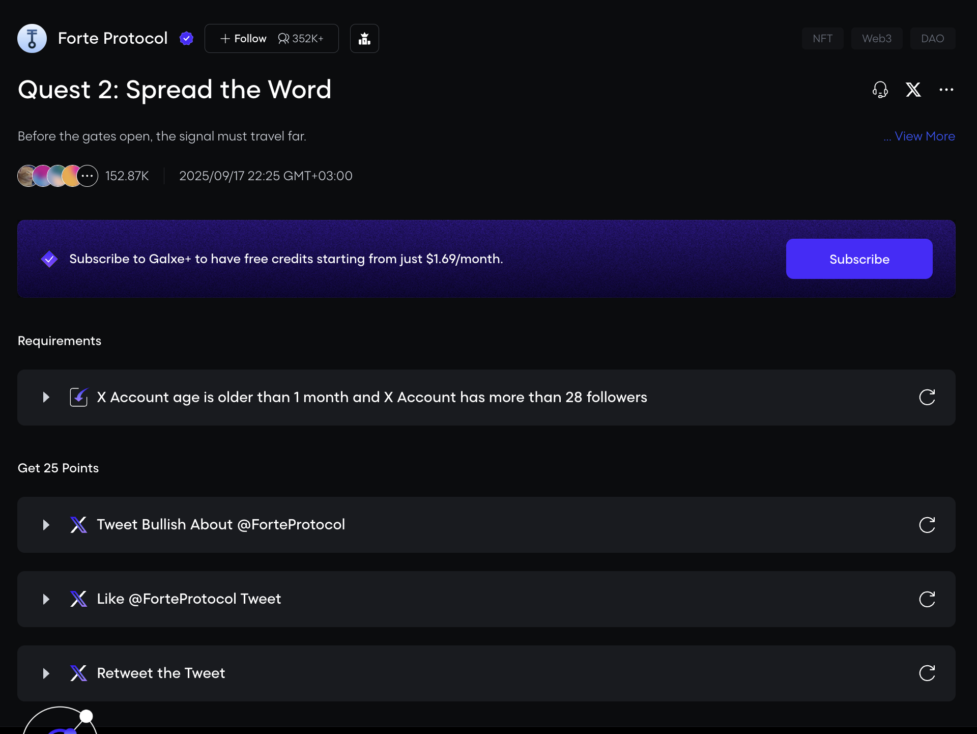 Forte has announced its first quest on Galxe! We can complete it, earn 25 points, and become early users.