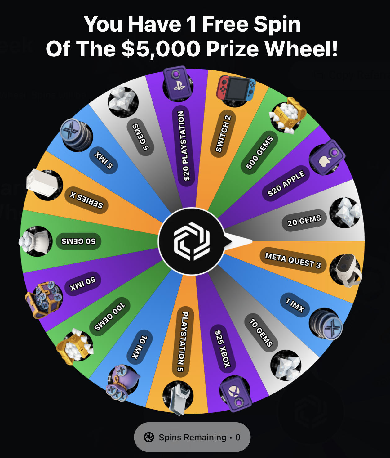 Immutable has added a wheel of fortune to its gaming portal. We can get free spins for inviting friends and try to win a PlayStation 5, $IMX tokens, and other rewards.