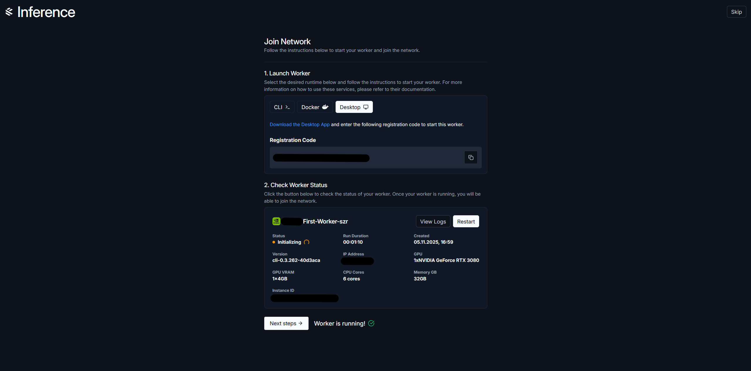 2. Launch a Worker node on a remote server or your computer following the instructions upon first login. Copy the Registration Code and paste it into the downloaded app to start the node. Note that before starting, you must wait for the LLM to download. You can check the download progress in the Logs section of the web interface.