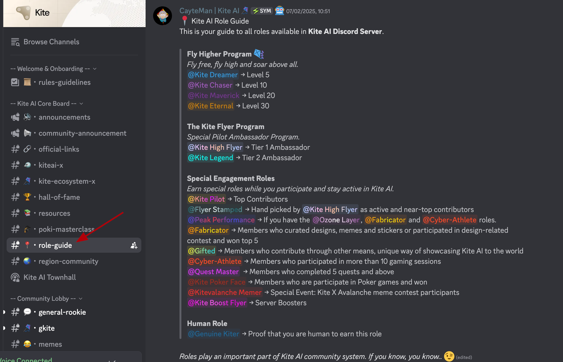 There is a role system in the KITE AI project Discord that can be obtained for various actions.