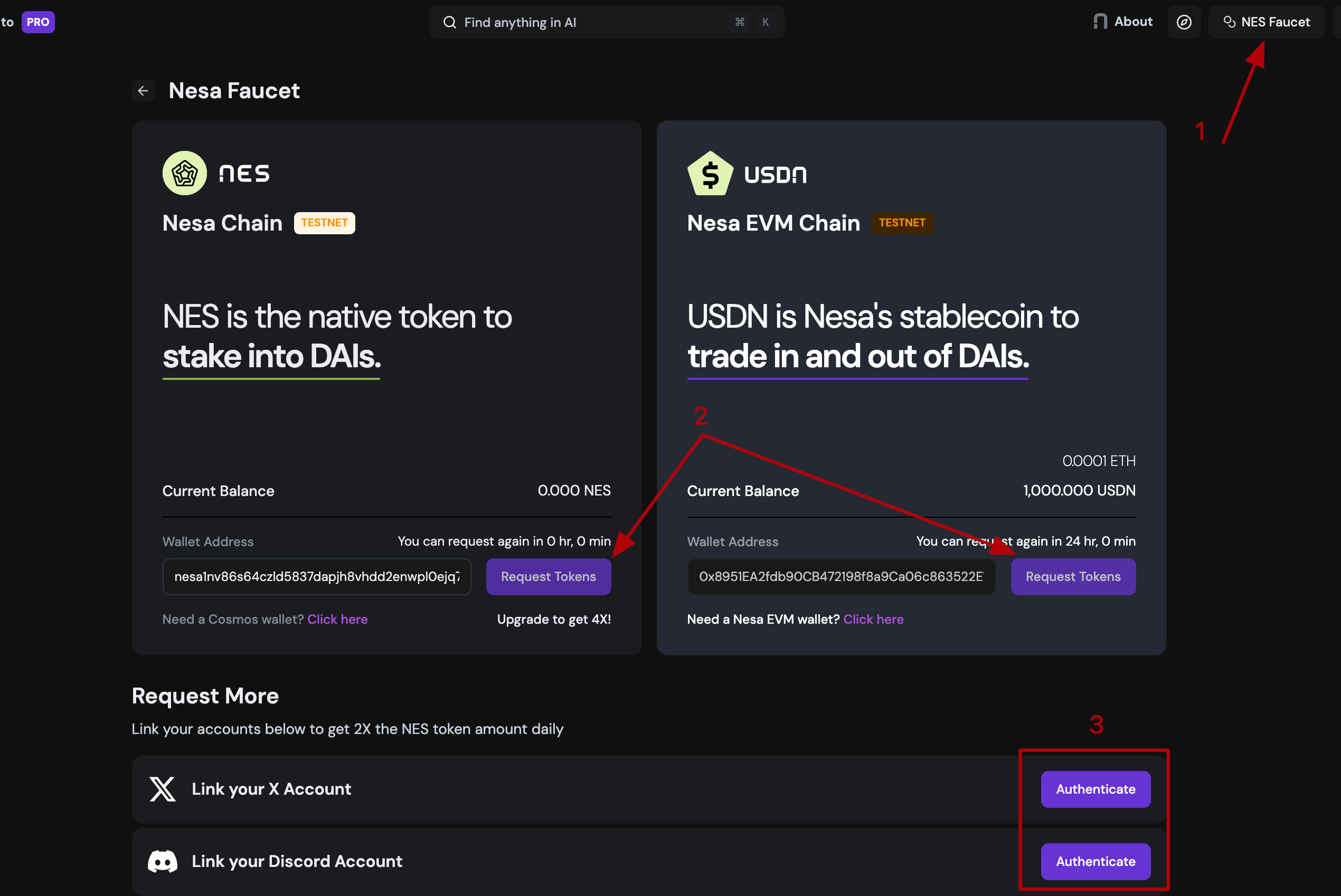 3. Click NES Faucet, connect your Cosmos and EVM wallets, and request test tokens. Then connect your social media accounts: