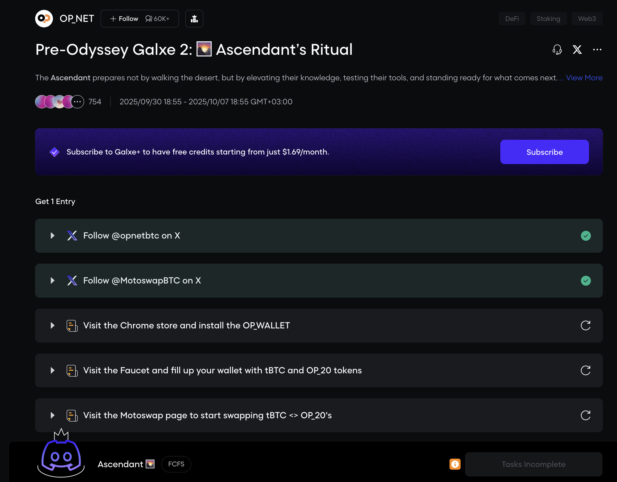 OP NET has launched a new campaign on Galxe. We can complete tasks and get the Ascendant role
