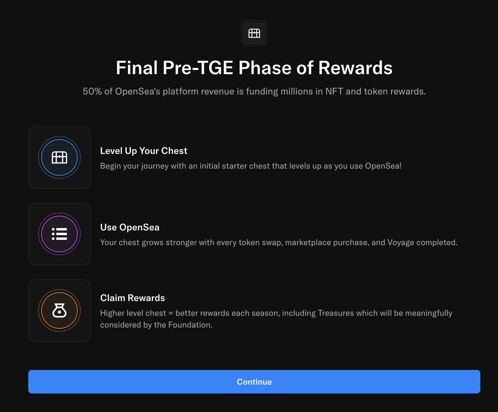 OpenSea has launched a Pre-TGE campaign with a prize pool of about $1.2M (in ARB, OP, and other tokens). During the campaign, we will improve the chest for completing daily tasks and purchasing NFTs. There are 12 chest levels available in total. All previously accumulated XP will be taken into this campaign. In addition to the main prize pool, chests may also contain rare NFTs (such as Pudgy Penguin).