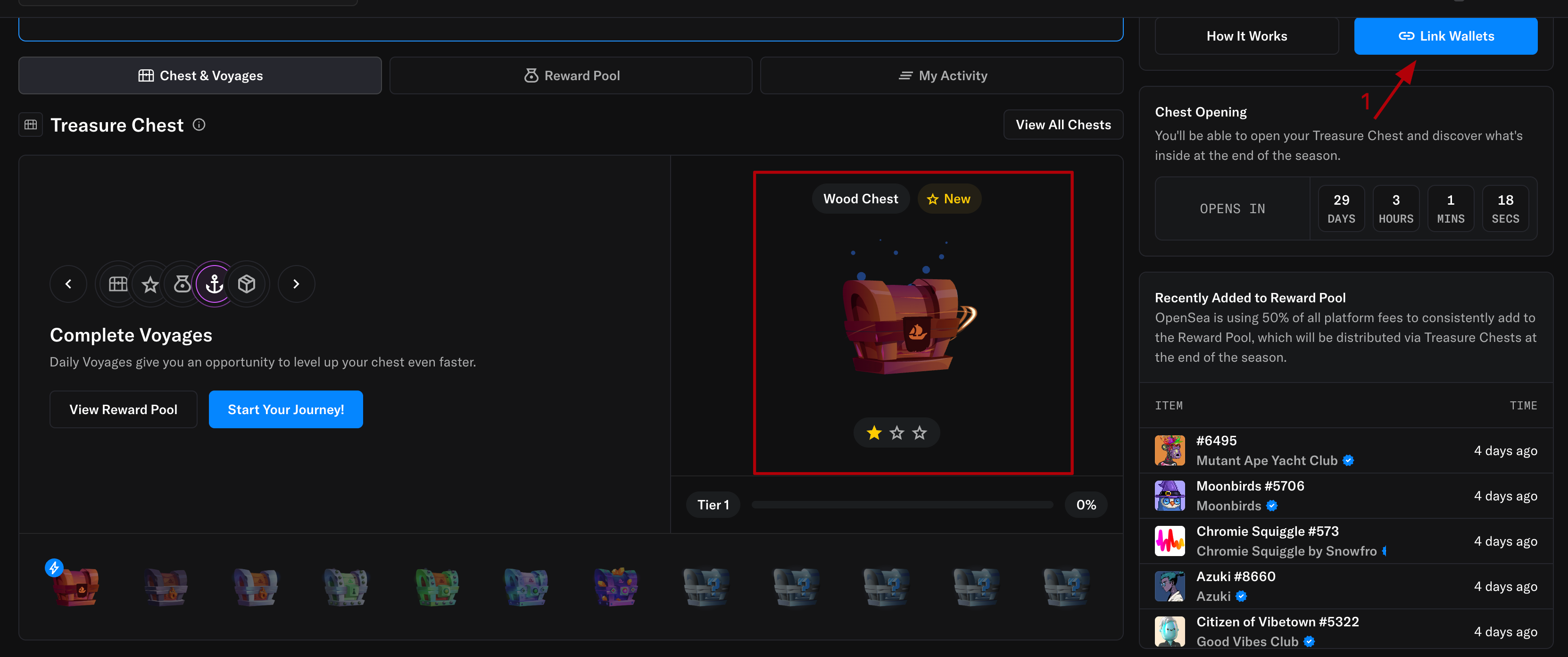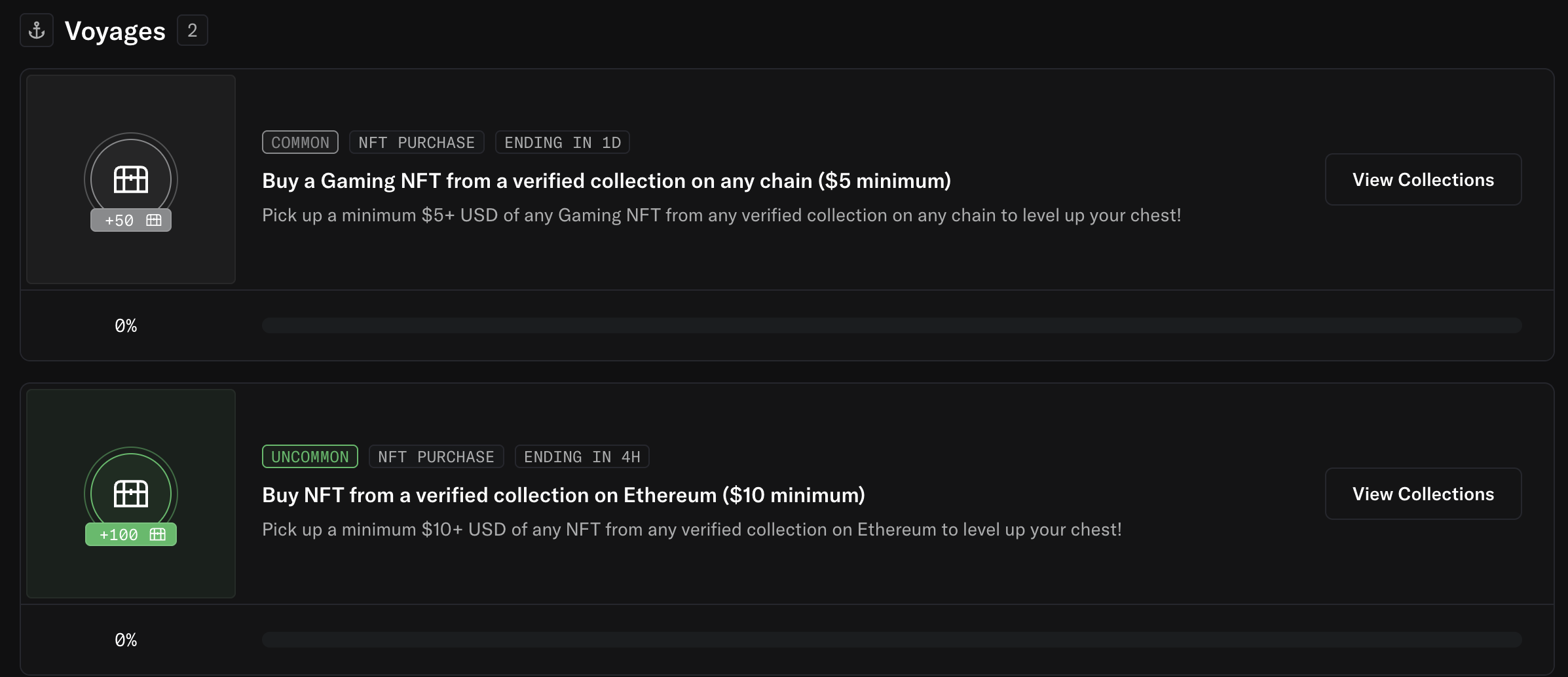 OpenSea has launched a new rewards program: Voyages. Voyages provide XP for use of novel features across OpenSea. Voyages have five rarity levels and each will appear at different intervals over the course of each week. Common, Uncommon, Rare, and Epic Voyages provide tiered XP rewards. Legendary Voyages will appear less frequently, much of the time in the form of Shipments, and will yield varying rewards including what we’re calling Treasures. Treasures will appear directly on your profile as you earn them.