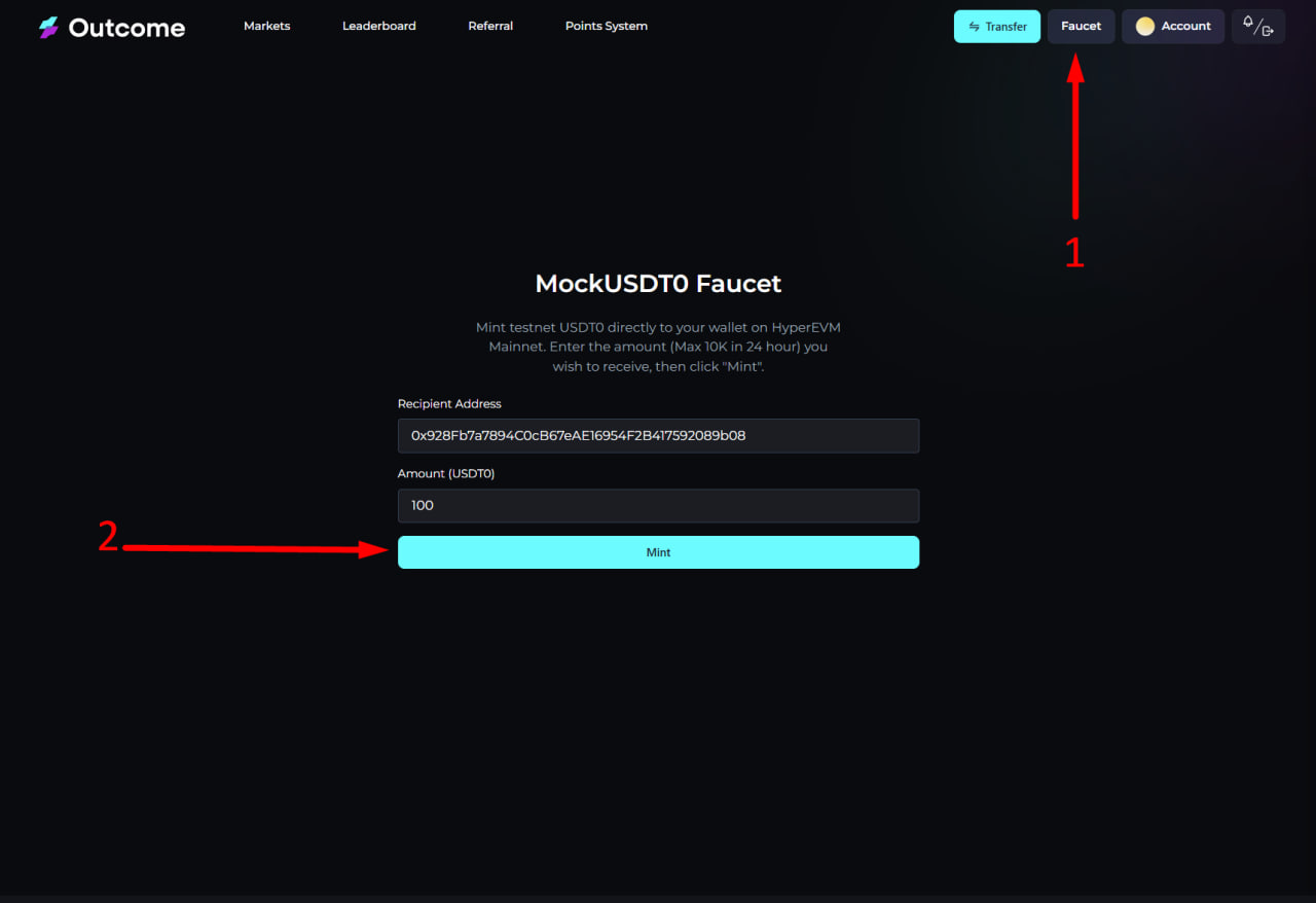 2. Go to the "Faucet" tab and request test tokens. You can request up to 10K test USDT0 every 24 hours