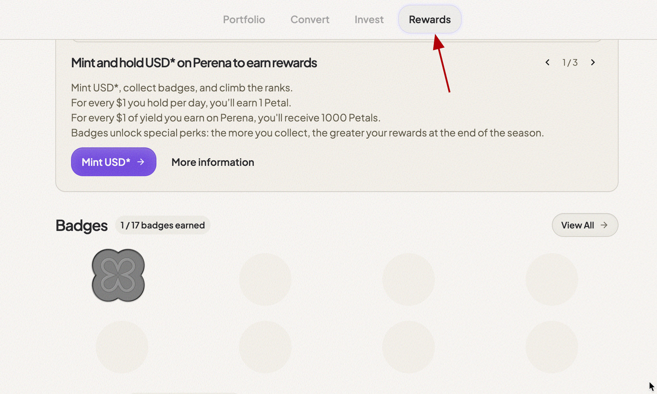 Perena has launched the first season of its points program! We can mint and hold USD*, collect badges, and climb the leaderboard. For every $ you hold, you will earn 1 point every day. For every $ of yield you earn on Perena, you will receive 1,000 points.