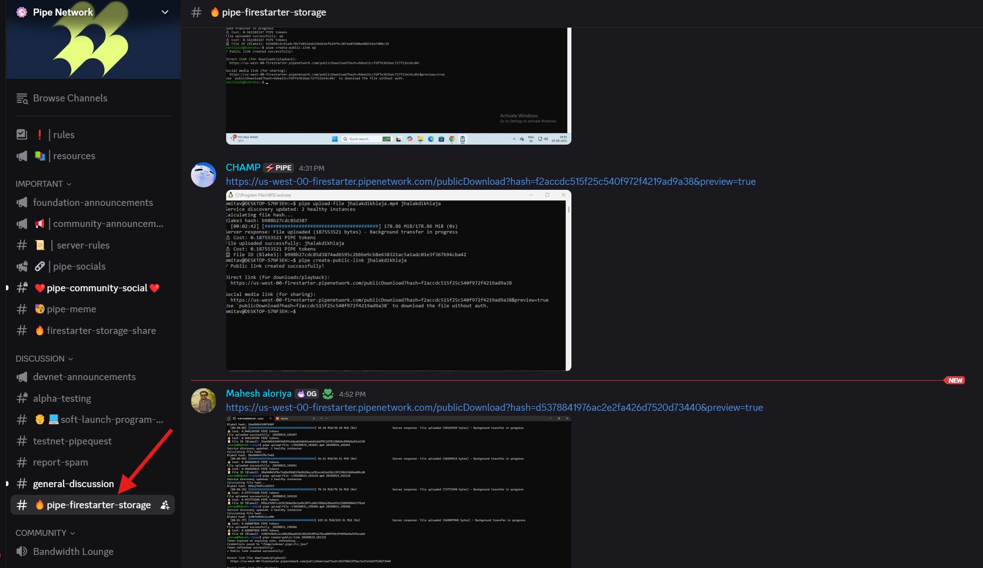 2. Interact with the data using your node and send a public link to the file to the pipe-firestarter-storage channel.