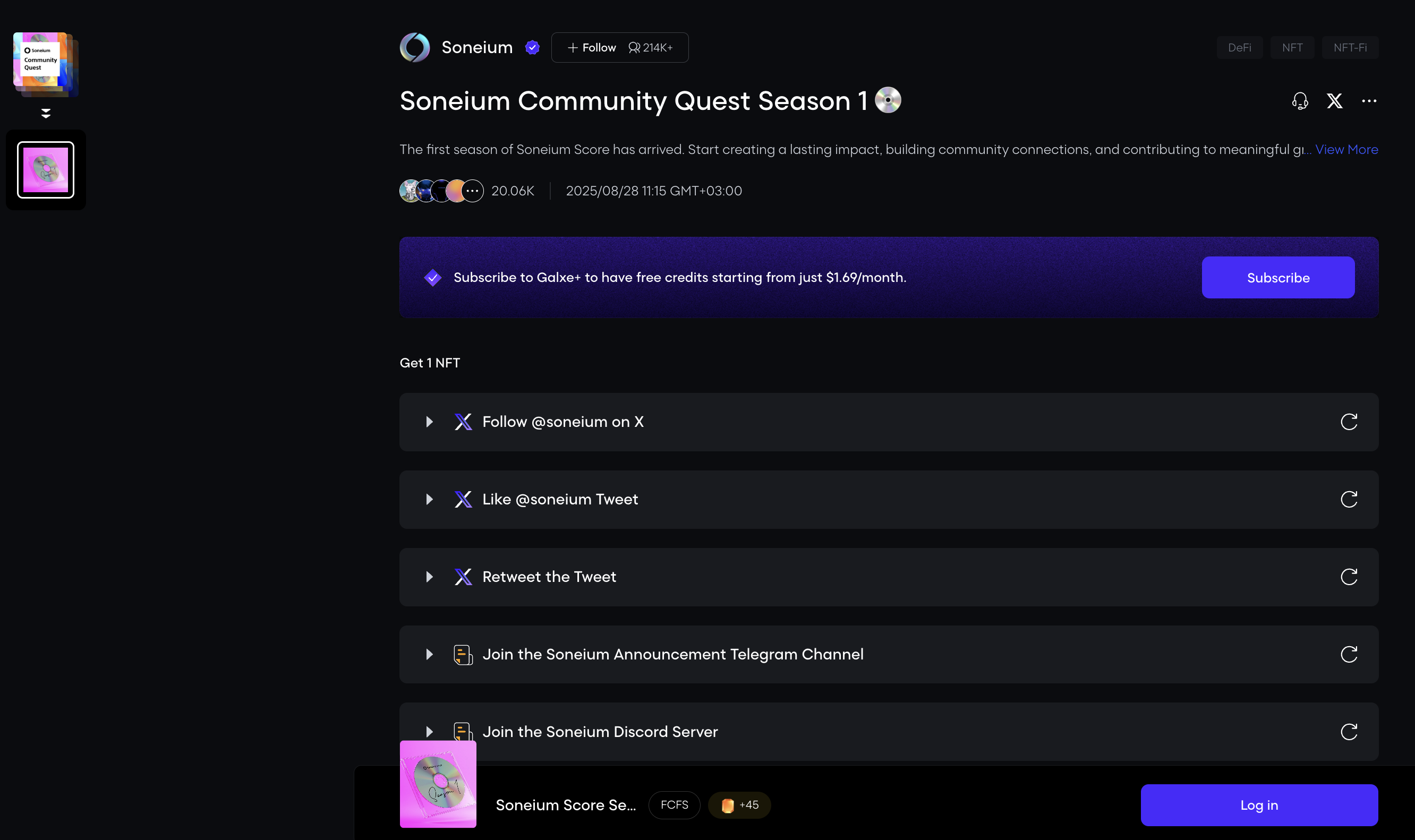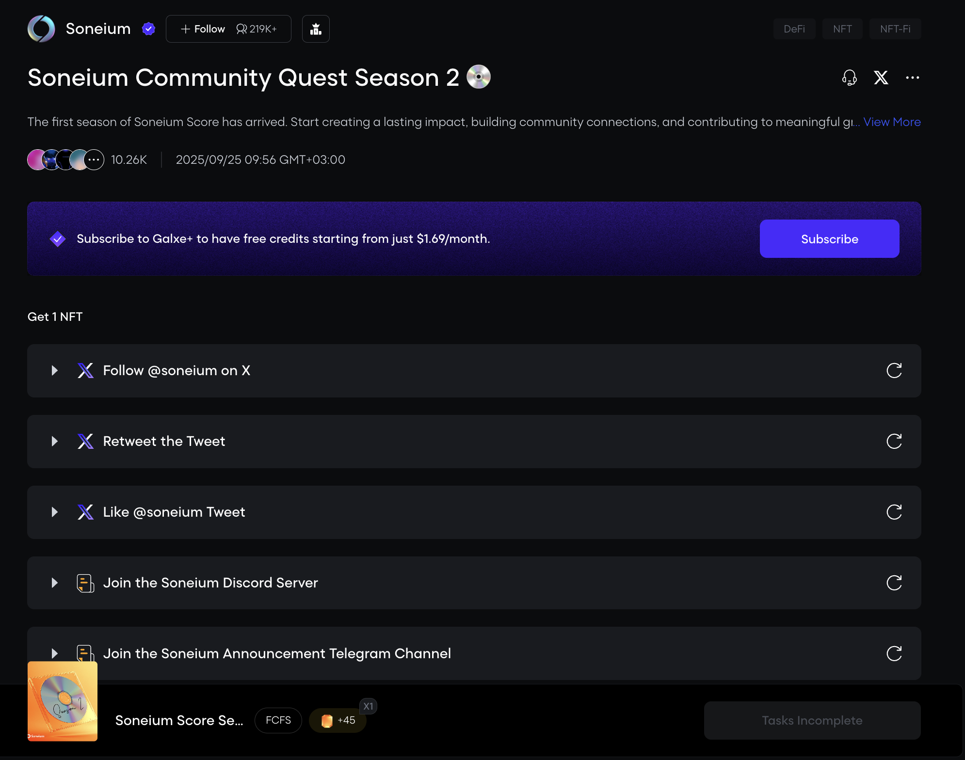 The Soneium Score campaign is also available on Galxe. Complete tasks and earn OAT.