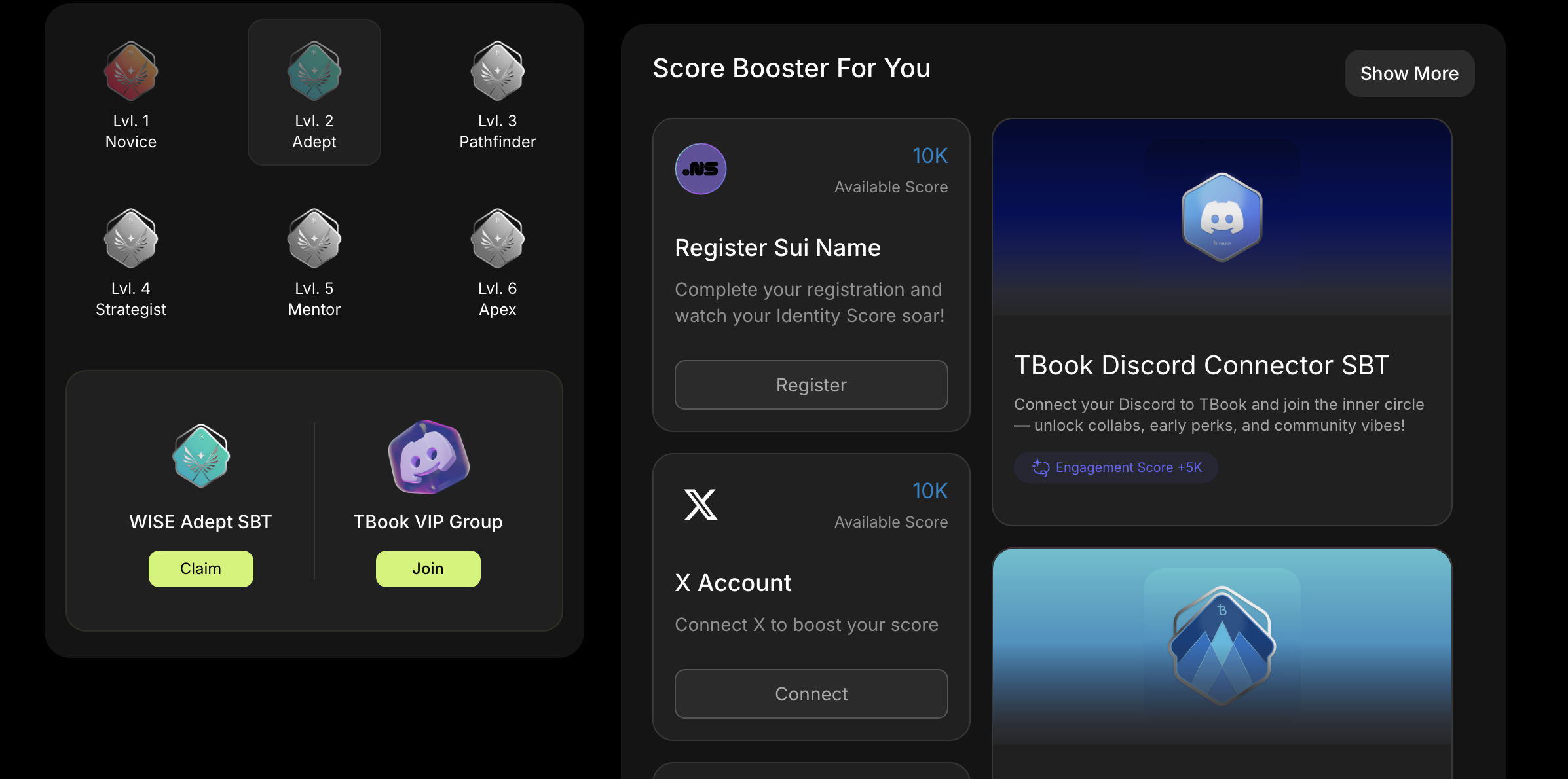 TBook has announced an activity in which we can increase WISE Score and claim 6 different SBTs. The score increases for inviting friends, completing tasks, and wallet activity.