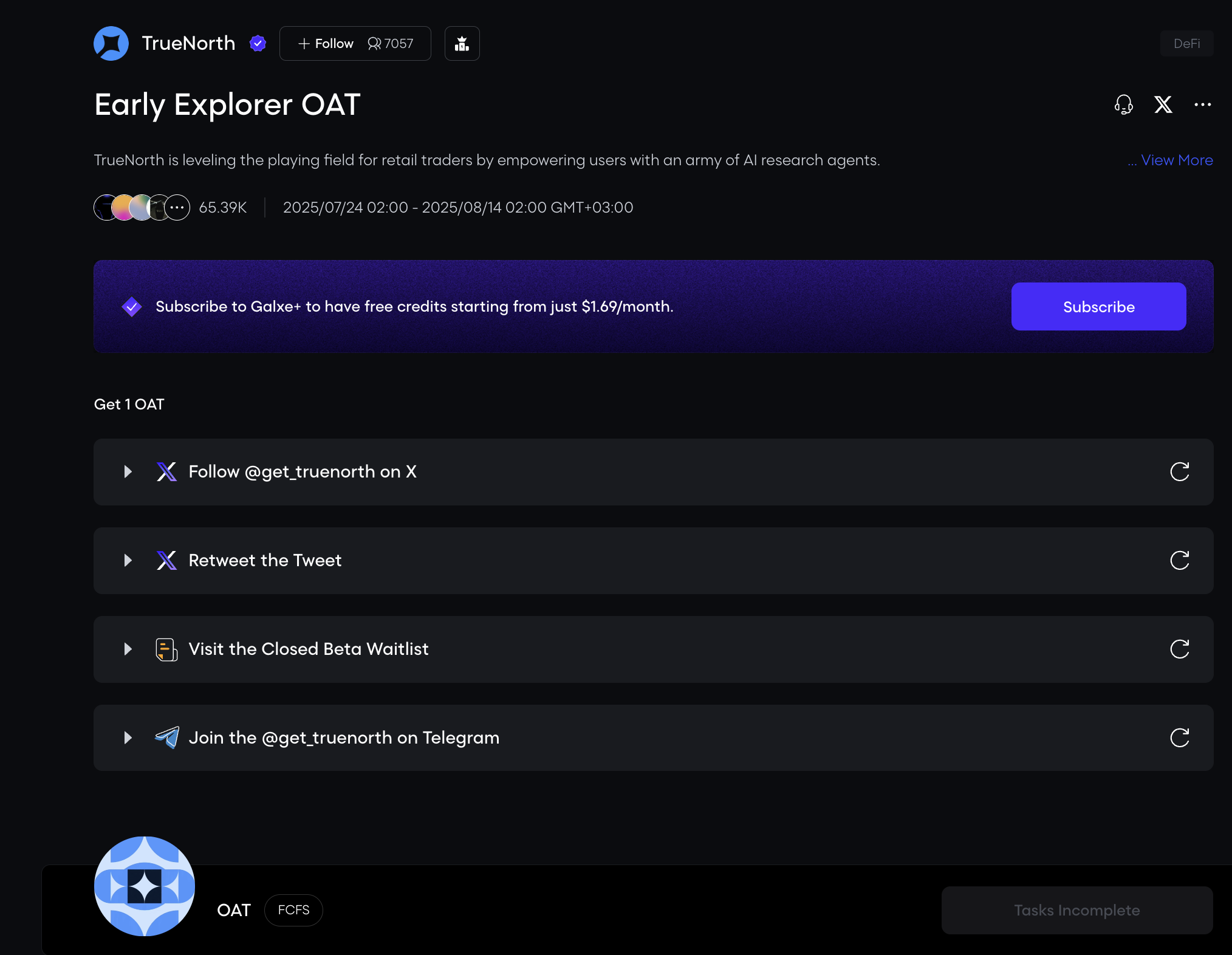 Complete the tasks to qualify for potential TrueNorth airdrops and rewards . Follow step-by-step instructions and track task updates and statuses to become one of the potential recipients of the TrueNorth Airdrop.