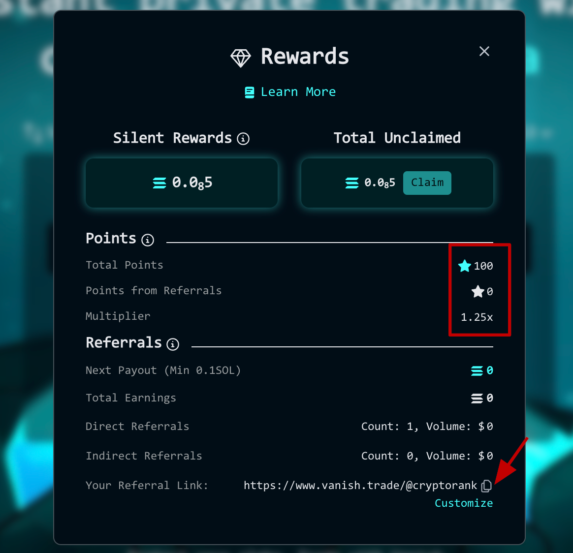 Vanish has announced a public beta with point farming! You can earn points in three ways: trading, holding, and referring new users. Every trade you place earns points - the more you trade, the more you accumulate. While in Shielded Mode, points are also generated based on the size and duration of your positions, with higher multipliers unlocked as you reach key thresholds. You can also invite friends with your unique referral link and earn additional points as they become active traders. Note that by interacting with the project at the beta stage, you can become an early user.