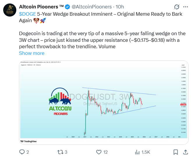 El operador observó que el precio de la DOGE está en la punta de una enorme cuña descendente de 5 años en el gráfico de 3 semanas.