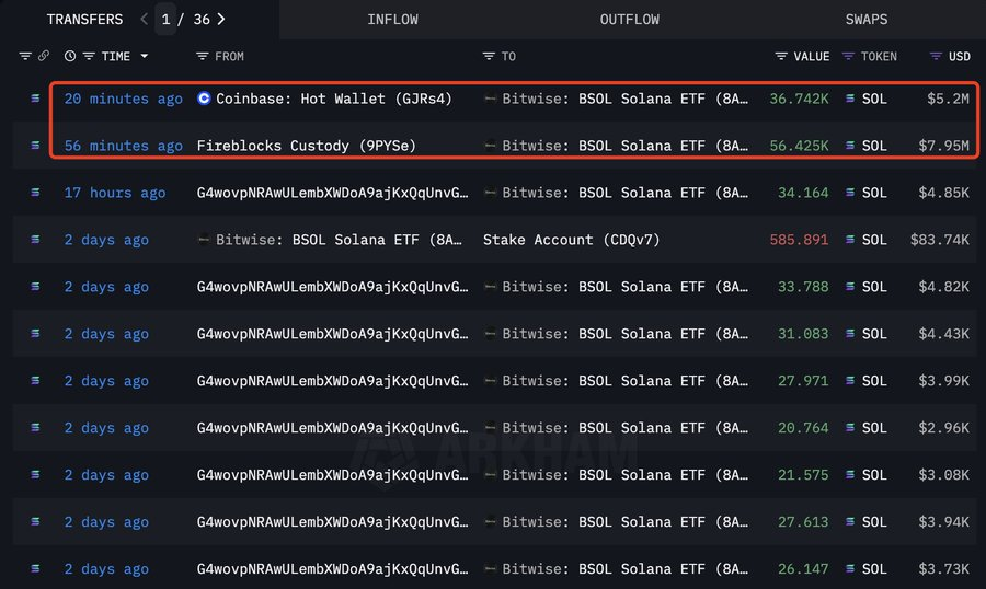 - Bitwise Solana Staking ETF acumuló 93.167 SOL por valor de 13,15 millones de dólares.