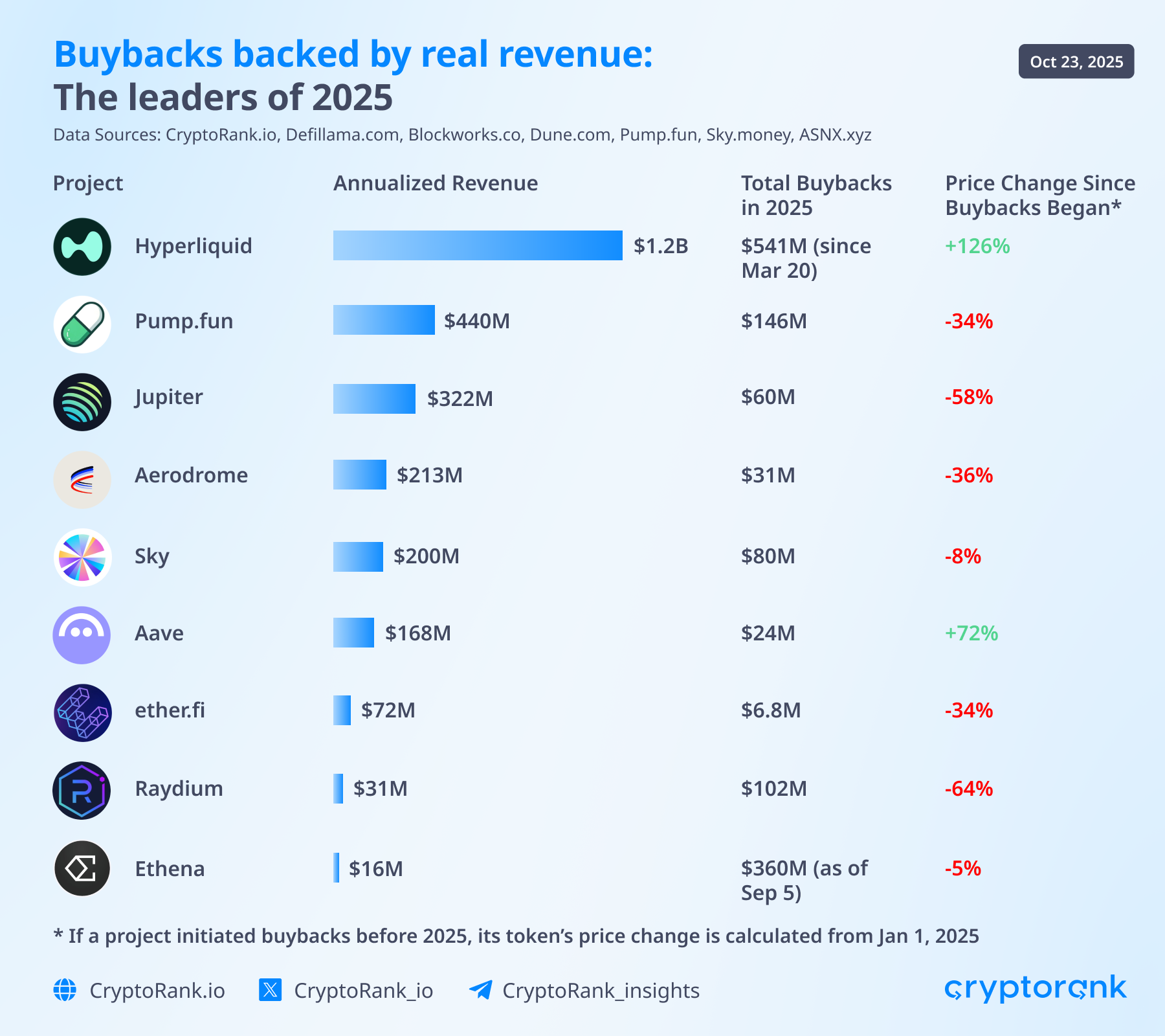 It turned out that only two tokens managed to grow and maintain their positions since the start of the buybacks, HYPE and AAVE. HYPE increased by 126% since the end of March, when the Hyperliquid Assistance Fund began actively buying the token. A one-time $20M buyback was one of the reasons HYPE relatively calmly withstood the recent market crash. Aave grew by 72% since April.