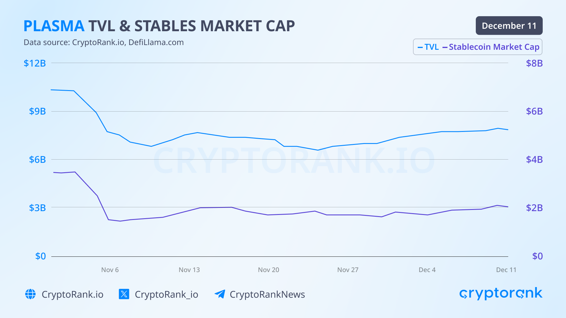 Plasma had a solid launch: the project’s TVL reached $14 billion within 5 days, immediately placing the chain in the top 10. Stablecoin market cap reached $6 billion, with around 80% USDT dominance.