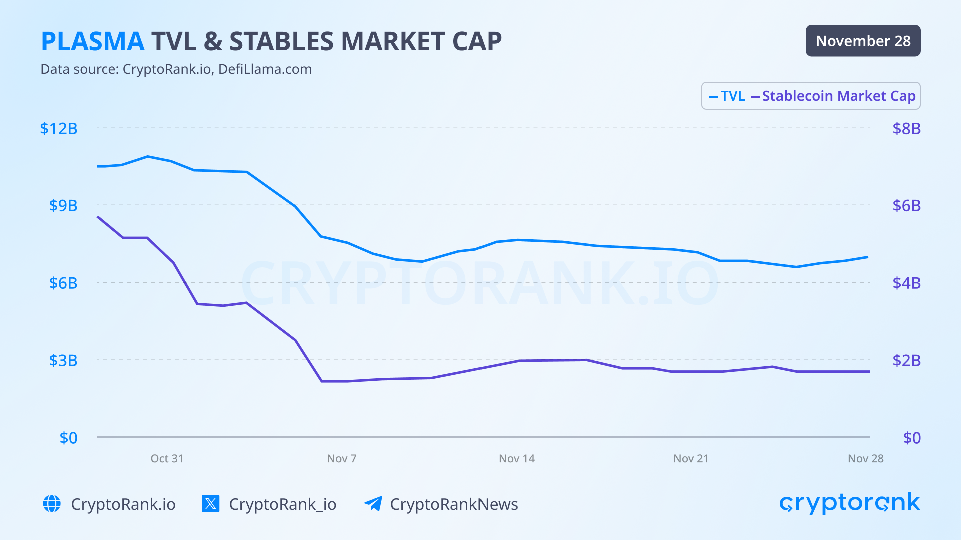 It’s been a tough month for Plasma, a newly launched L1 built specifically for stablecoins. The chain’s stablecoin market cap fell by more than 68%, dropping from $5.1B to $1.66B. Plasma’s TVL also declined by 34%, reaching $7B.