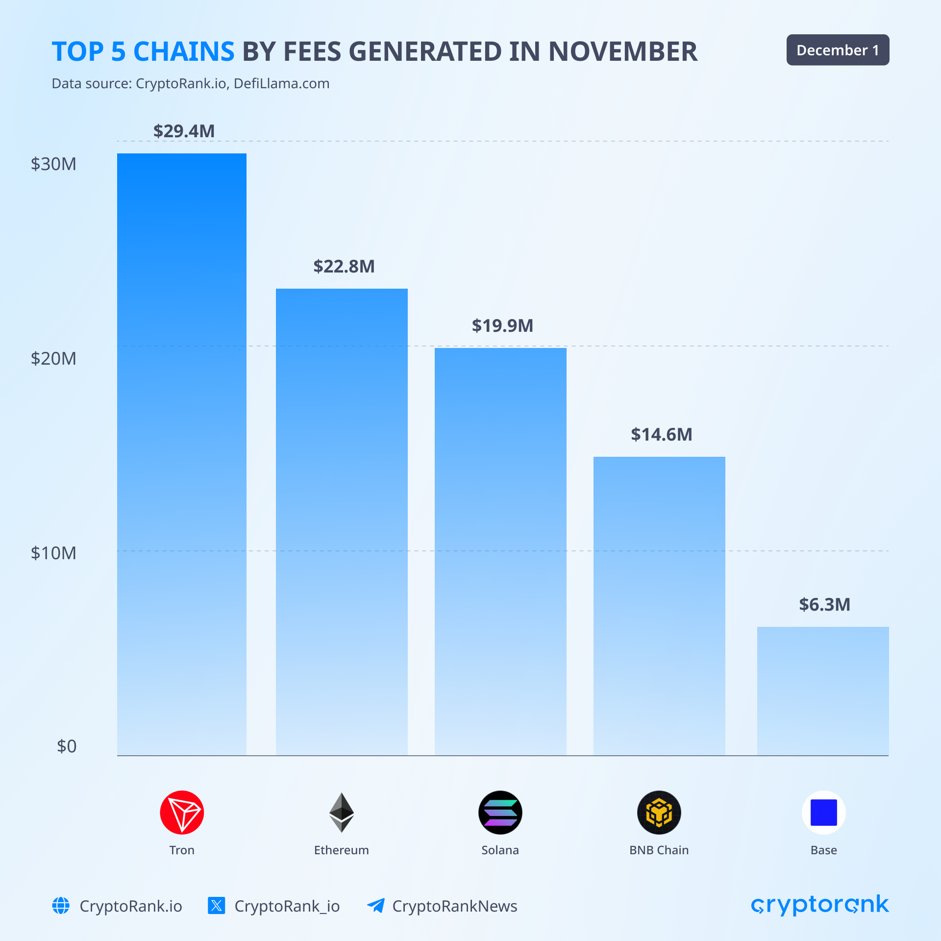 It’s been a month of ups and downs for Tron in November. The network generated its lowest fee amount since January 2023 at $29.4M, though it still remains the highest among all chains. Around 84% of all Tron fees now come from USDT transfers.