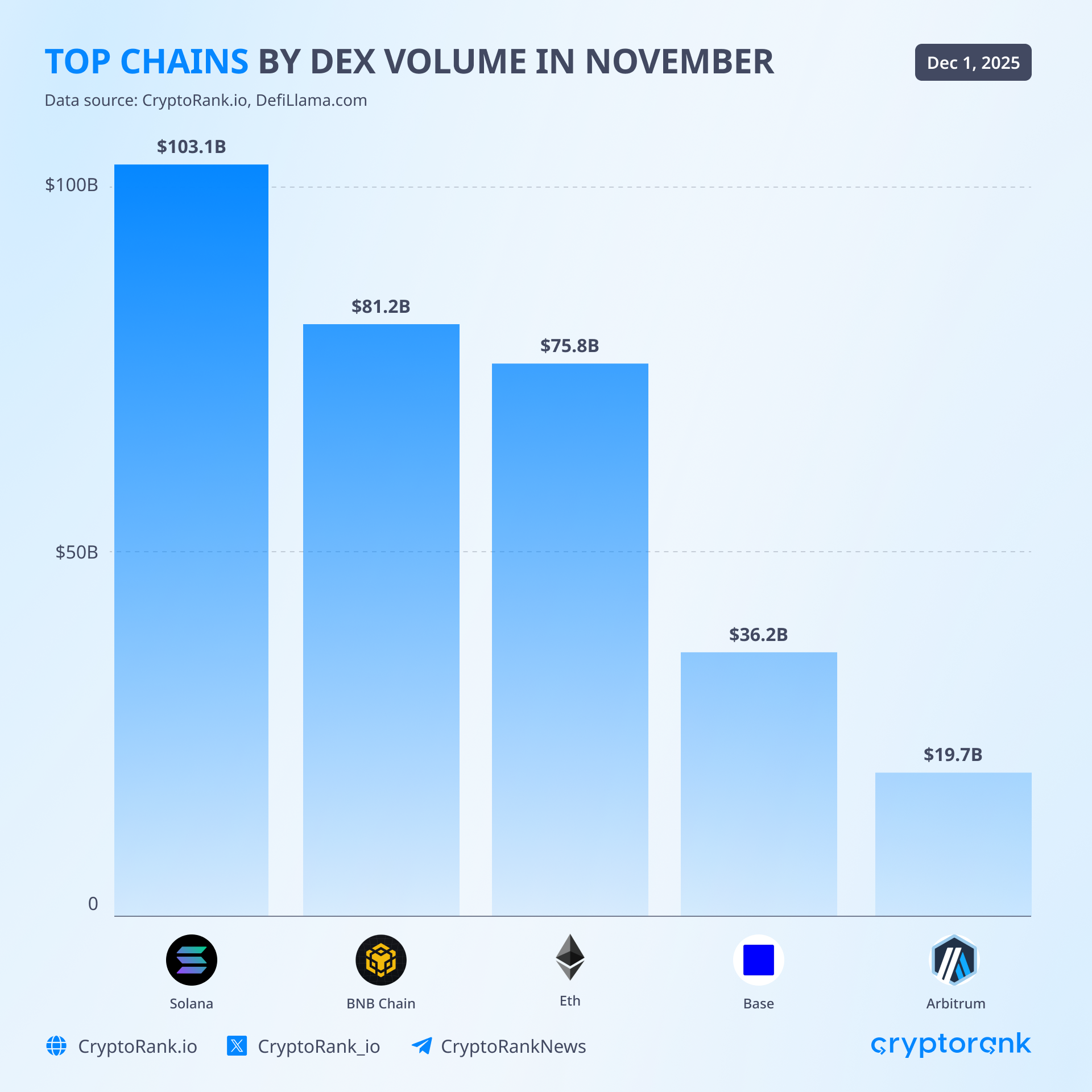 DEX volume fell to $104B, but it’s still the top result among all chains. Meanwhile, memecoin volume only accounts for 5% of the total chain volume, the lowest level since memes exploded two years ago. A decrease in memecoin activity is seen as the key driver behind the falling numbers. Solana is now experiencing a strong competition from Base and other high-risk “memecoin substitutes”, like perps and predictions.