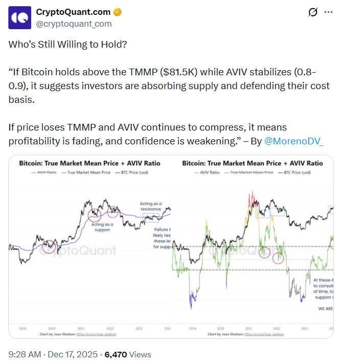 CryptoQuant analyst MorenDV highlighted that Bitcoin is sitting at a level that matters beyond looks. He explained this using two key metrics, True Market Mean Price (TMMP) and AVIV Ratio.