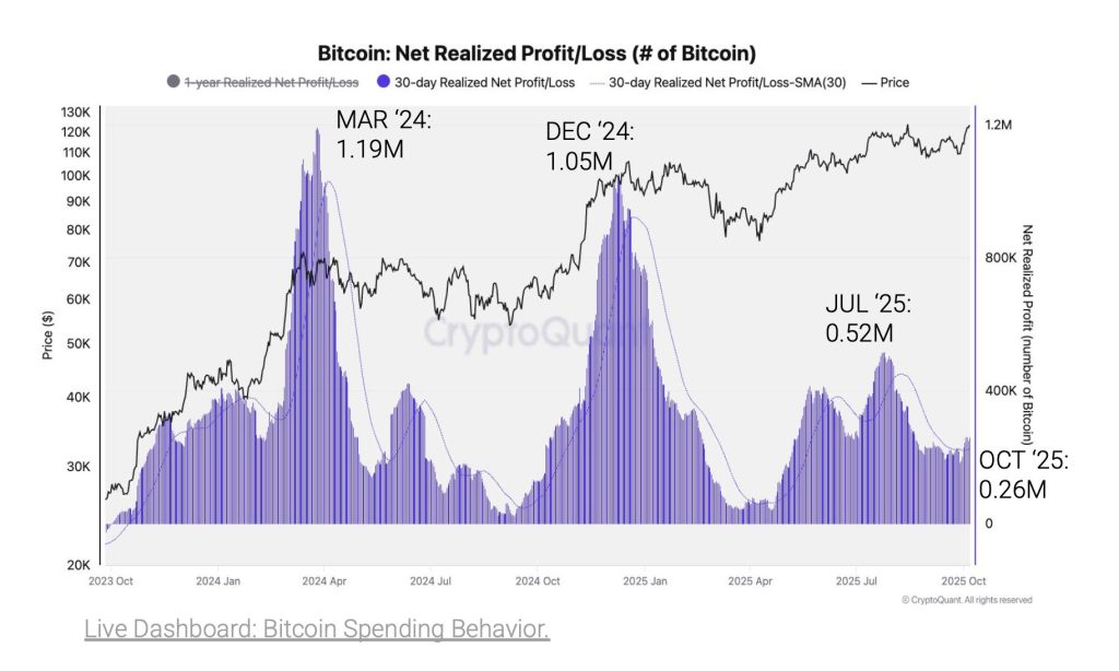 Data shows Bitcoin holders’ net realized profits over the last 30 days stand at 0.26 million BTC, equivalent to roughly $30 billion in profits. This is 50% below levels typically associated with local tops, such as the 0.53 million BTC ($63 billion) recorded in July 2025.