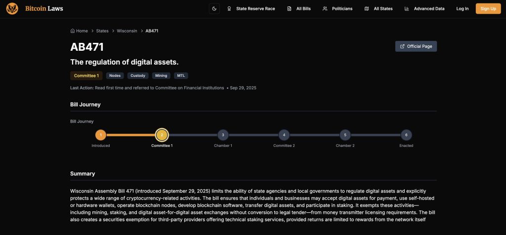 Lawmakers in Wisconsin are pushing forward Assembly Bill 471, a proposal that could significantly reshape the state’s approach to crypto regulation by exempting several digital asset activities from money transmitter licensing requirements.