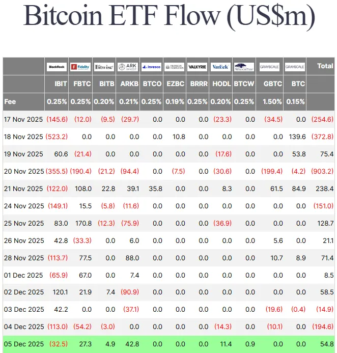 On December 5, the investment instrument recorded an inflow of $54.8 million, but Ark Invest’s ARKB provided the biggest boost with $42.8 million influx.