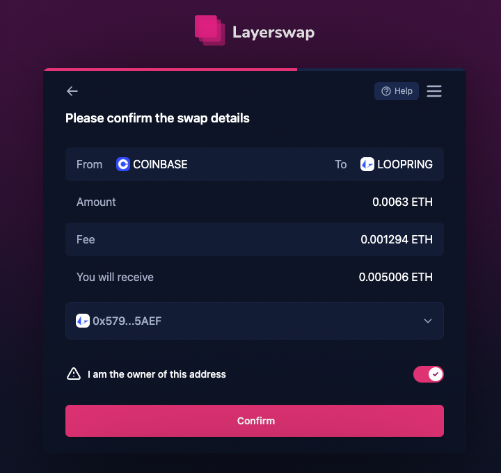 Before finalizing the swap, you’ll need to review and confirm the details. On the swap review page, you’ll see all the necessary information including source, destination, amount, fee, address, and will need to confirm that you’re the owner of the provided address.