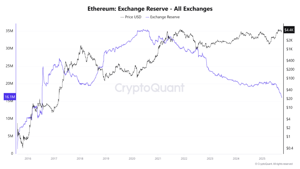 Exchange reserves have fallen to around 16.1 million ETH, down more than 25% since 2022, indicating a structural decline in selling pressure.