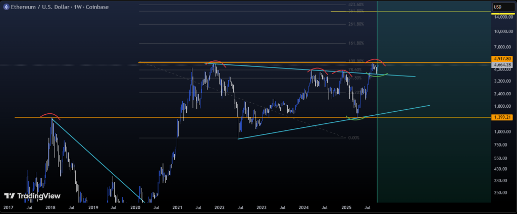 On the technical front, the weekly Ethereum chart shows a key inflection point as price once again tests the major resistance zone around $4,800, a level that has rejected ETH multiple times since 2021.