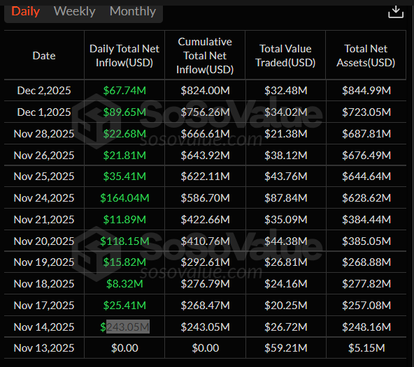 Según los datos de SoSoValue, la entrada neta total acumulada en el instrumento de inversión ascendió a 824 millones de dólares hasta el 2 de diciembre.