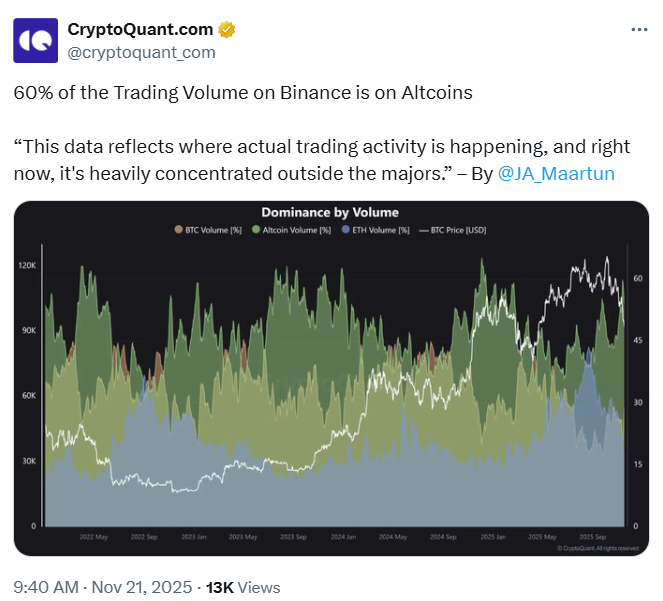 Cryptoquant analysis showed that altcoins made up the largest share of activity on Binance.