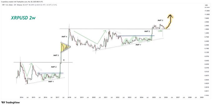 - Según el analista, el gráfico de 2 semanas del precio del XRP está repitiendo el mismo patrón a largo plazo que llevó a su ruptura en 2017.