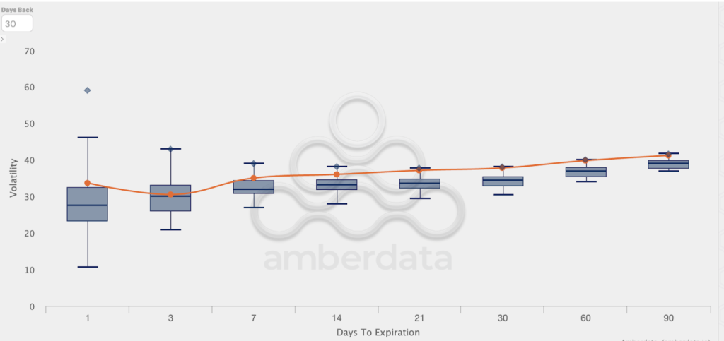 Term structure of BTC volatility with box plots overlaid to highlight historical ranges: