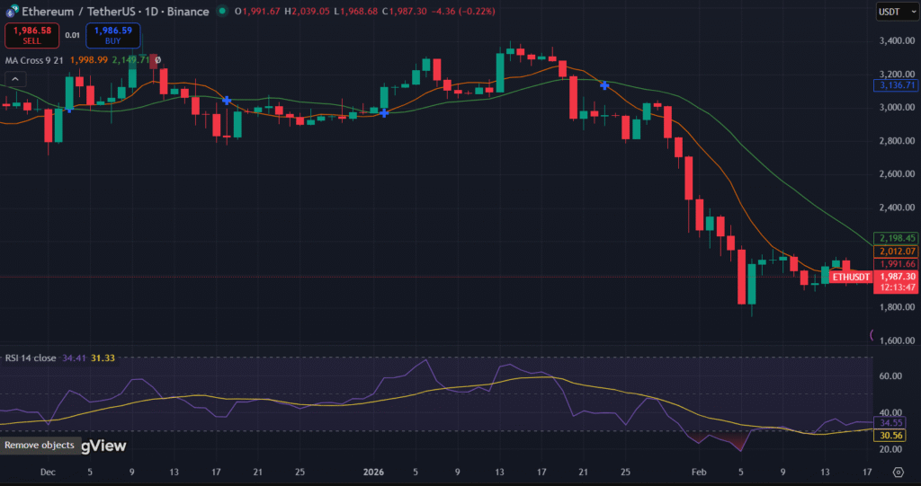 On the ETH/USTD chart ETH price trading below the 9-day moving average at $2,012.07 and the 21-day moving average at $2,198.45, indicating continued downward momentum. This shows ETH forming lower highs and lower lows, with recent trading consolidating just below the $2,000 level.