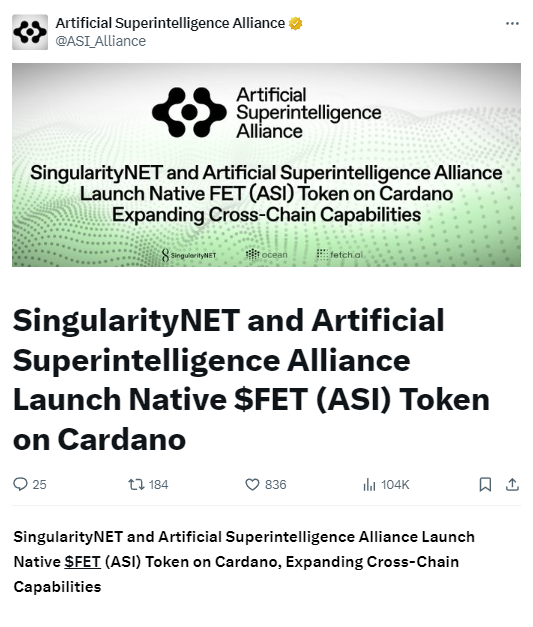 Meanwhile, just days ago, the Alliance deployed the FET native token on the Cardano blockchain.