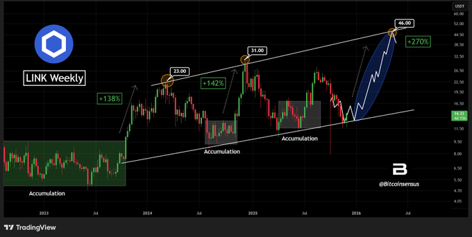 - La parte superior del canal de precios a largo plazo de LINK se sitúa en torno a los 46 $, lo que coincide con el próximo objetivo alcista.