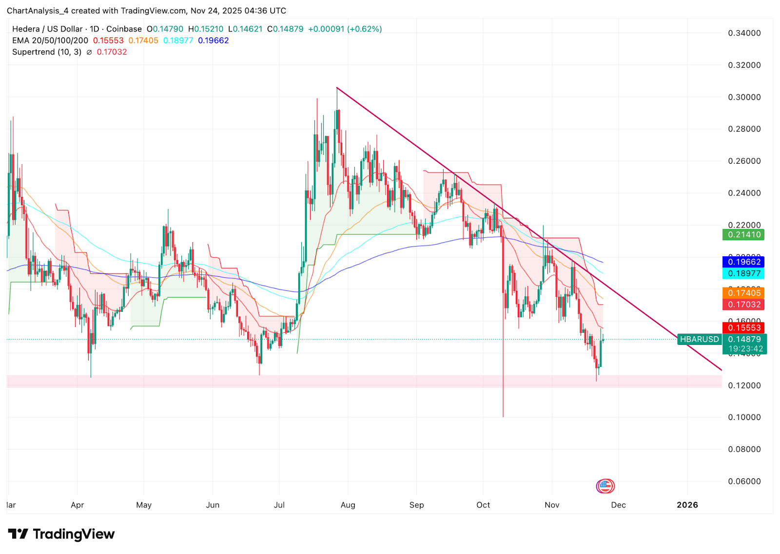 Hedera price today trades near $0.148 after a sharp rebound from the $0.125 demand zone. The recovery lifts short term momentum, but the broader structure still leans bearish as HBAR trades below a dominant descending trendline that has capped every rally since September.