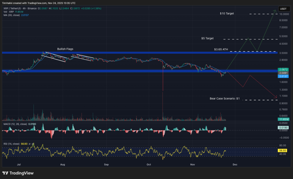 From a technical perspective, XRP has traded stably for months, forming repeated bullish flag patterns that have yet to break upward. With the Relative Strength Index (RSI) around 57, the token is recovering somewhat, having risen 3% in the past 24 hours.