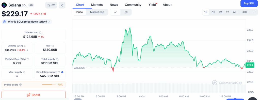 SOL price has plummeted by 1.02% over the last 24 hours. The token is currently exchanging hands at $229.17, with a decline of 8.4% in the 24-hour trading volume. However, the price reflects a surge of 13.65% and 9.97% in the last 7 days and 30 days, respectively.