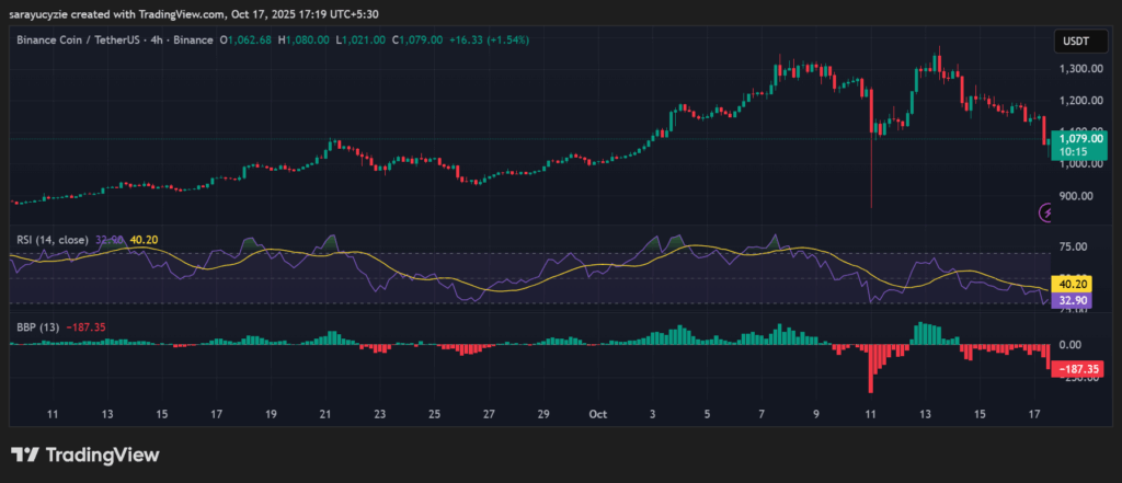 - BNB has pulled back 10%, now trading at $1,065.