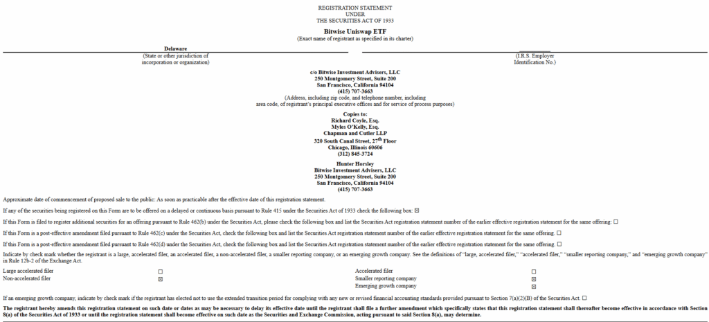 - Bitwise filed with the SEC for the first ETF focused on Uniswap.