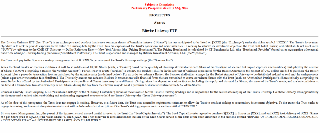 Bitwise Asset Management has filed a registration statement with the U.S. Securities and Exchange Commission to launch an exchange-traded fund focused on Uniswap. The offering would give investors regulated exposure to the governing UNI token via a traditional investment vehicle. If approved, it will become the first ETF to focus on a DeFi protocol token in the United States.