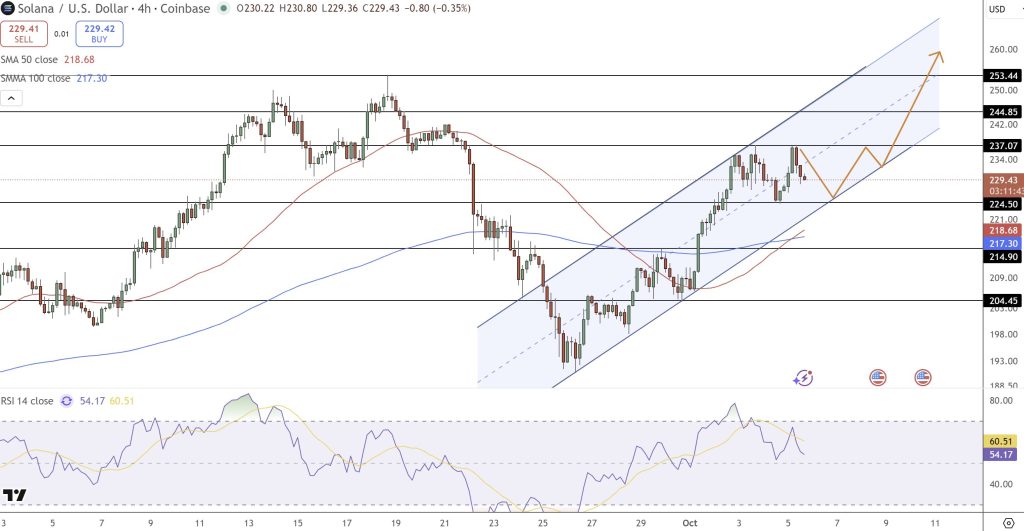 On the charts, the Solana price prediction appears bullish, as SOL is maintaining a rising channel structure, oscillating between support at $218 and resistance at $253.
