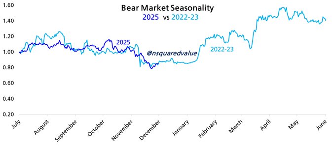 A chart accompanying his analysis suggests that, if history repeats itself, Bitcoin may not see a true rebound until well into the first quarter of 2026.